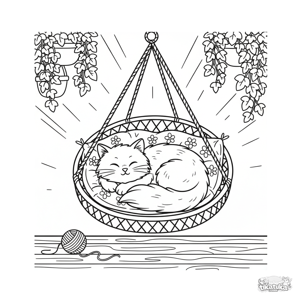 Раскраска для детей 4-6 лет: пушистый кот сладко спит в подвесном кресле-гамаке на веранде дачи. Уютная сцена с подушкой, клубком ниток и растениями.