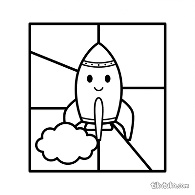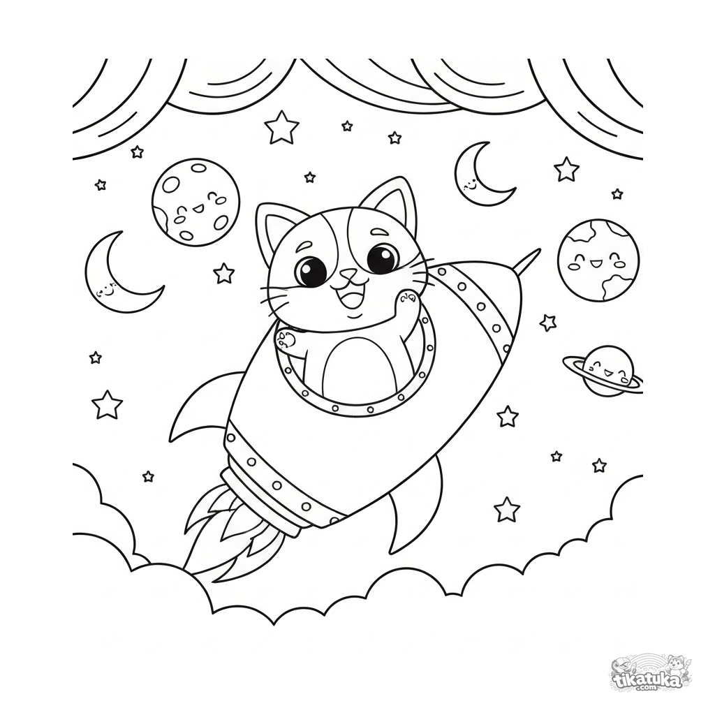 Весёлый котопёс летит на дружелюбной ракете среди звёзд и планет. Отличная раскраска для маленьких мечтателей!
