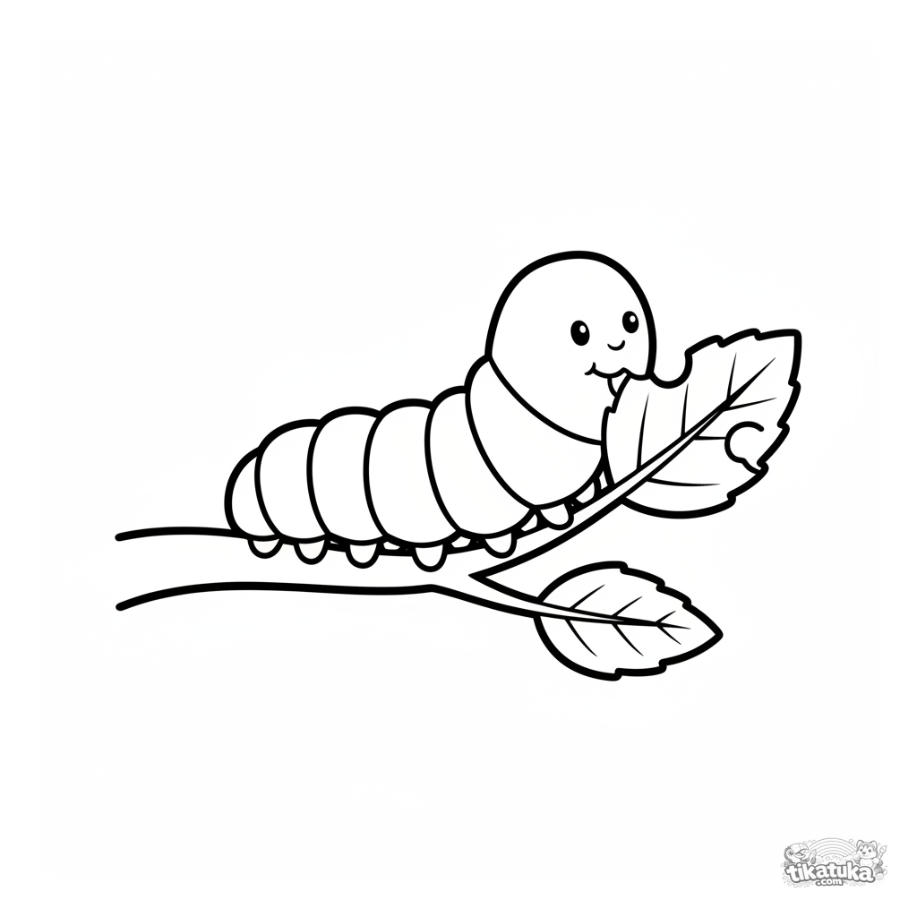Простая раскраска для малышей 2-3 лет с толстой полосатой гусеницей на ветке. Крупные четкие формы, минимум деталей, идеально для первых опытов с карандашами.