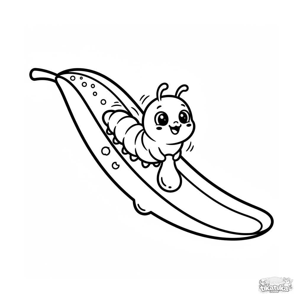 Простая милая раскраска для малышей 2-3 лет: гусеница в стиле кавайи весело скатывается с капельки росы, как с горки, на большом листе. Очень простые контуры.