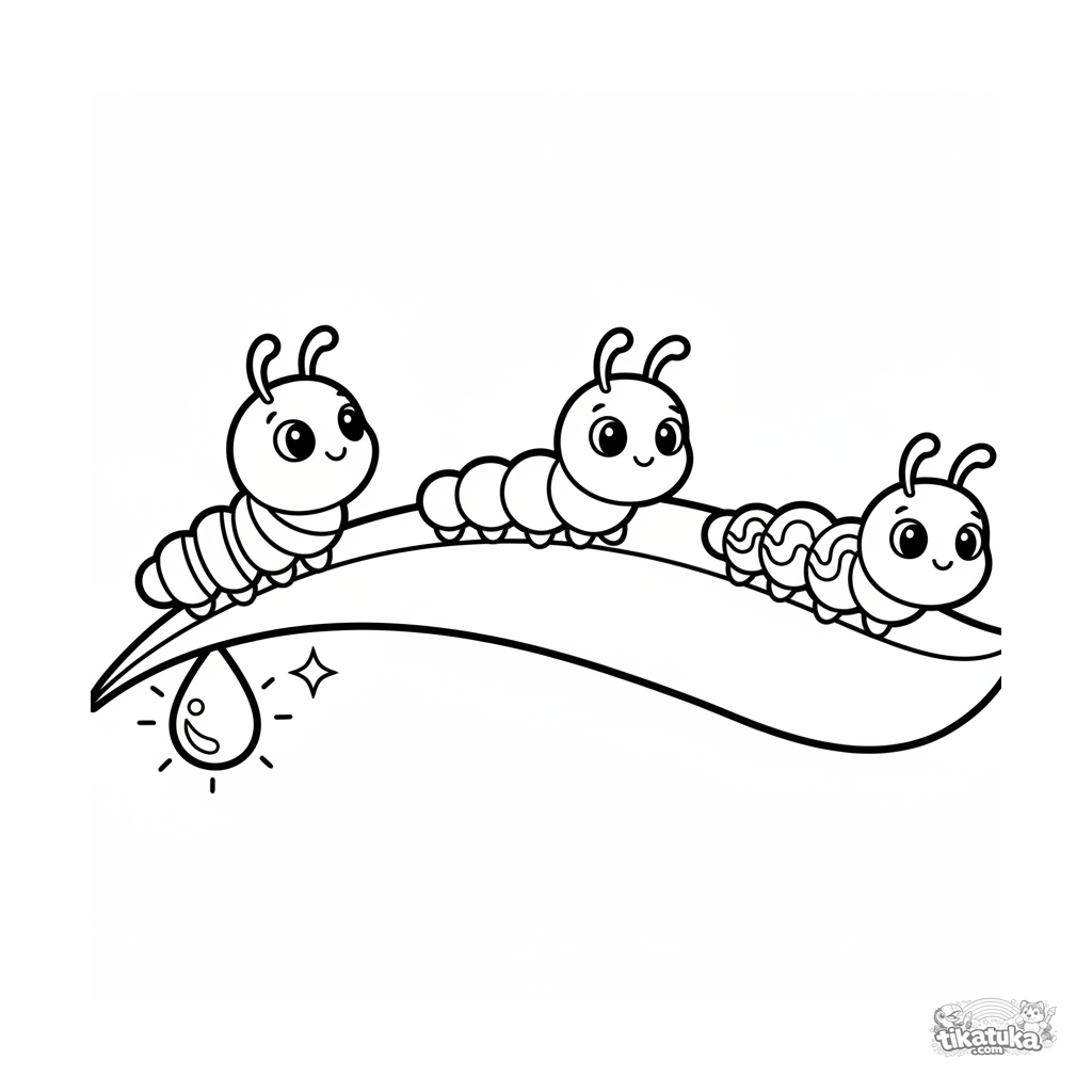 Раскраска для малышей 2-3 лет: три весёлые гусеницы идут парадом по листу-мосту над каплей росы. Очень простые формы и толстые контуры.