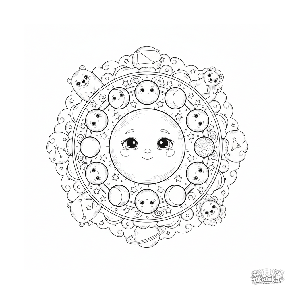 Сложная небесная мандала-раскраска для детей 10-12 лет. Фазы луны, созвездия, планеты и облака в симметричном узоре, идеально для любителей космоса и детального творчества.