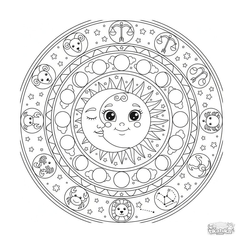 Небесная мандала с солнцем и луной для раскрашивания детьми 10-12 лет. Включает фазы луны, звезды и символы зодиака. Сложный симметричный дизайн с высоким уровнем деталей.