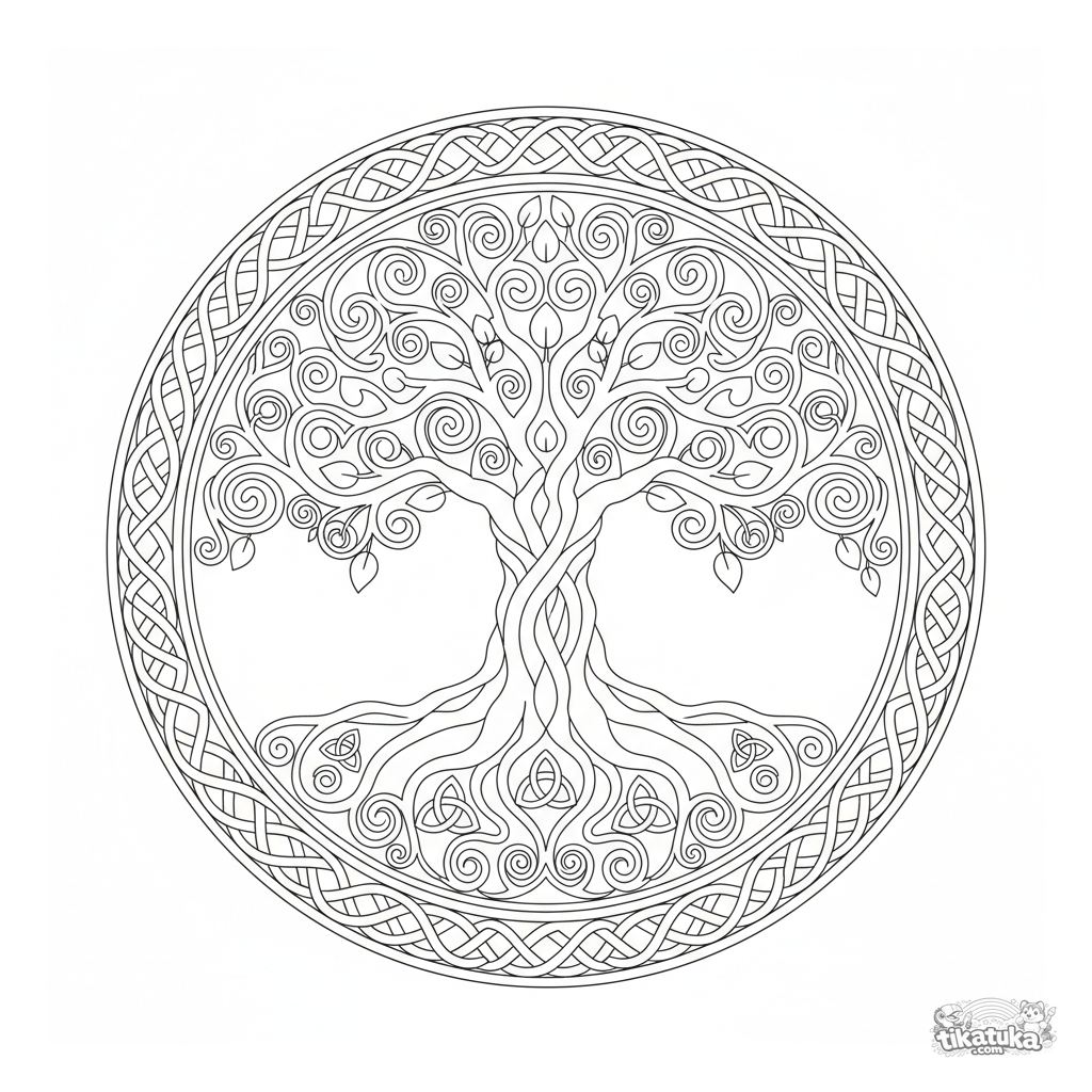 Детальная мандала-раскраска Древо Жизни в стиле кельтских узлов для детей 10-12 лет. Переплетающиеся ветви, спирали, символы триединства, идеальная симметрия.