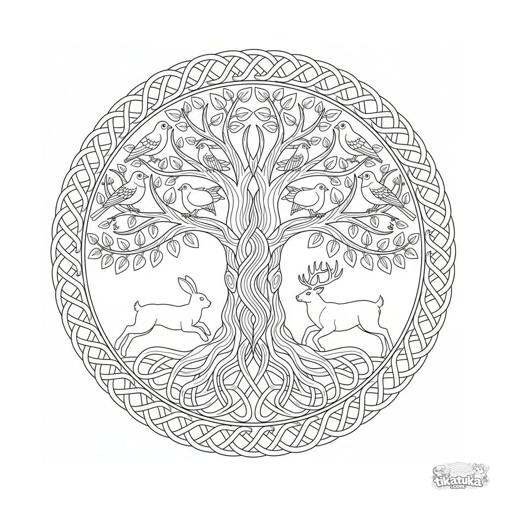 Сложная кельтская мандала-раскраска Древо Жизни для детей 10-12 лет. Дерево из плетеных узлов, в ветвях спрятаны силуэты животных, внешнее кольцо - непрерывный бордюр.