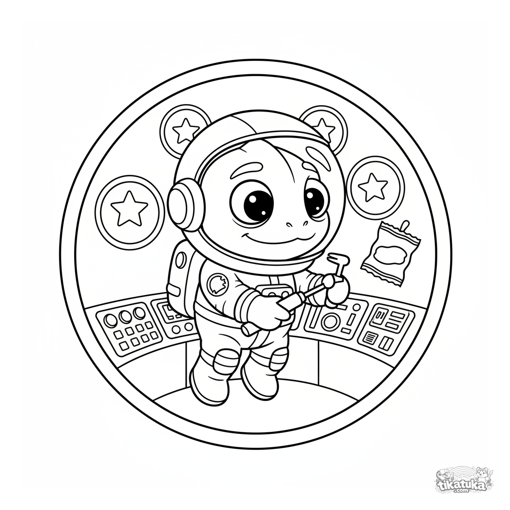 Раскраска для детей: хамелеон Радик в скафандре работает на космической станции. Милая сцена для развития воображения и мелкой моторики.