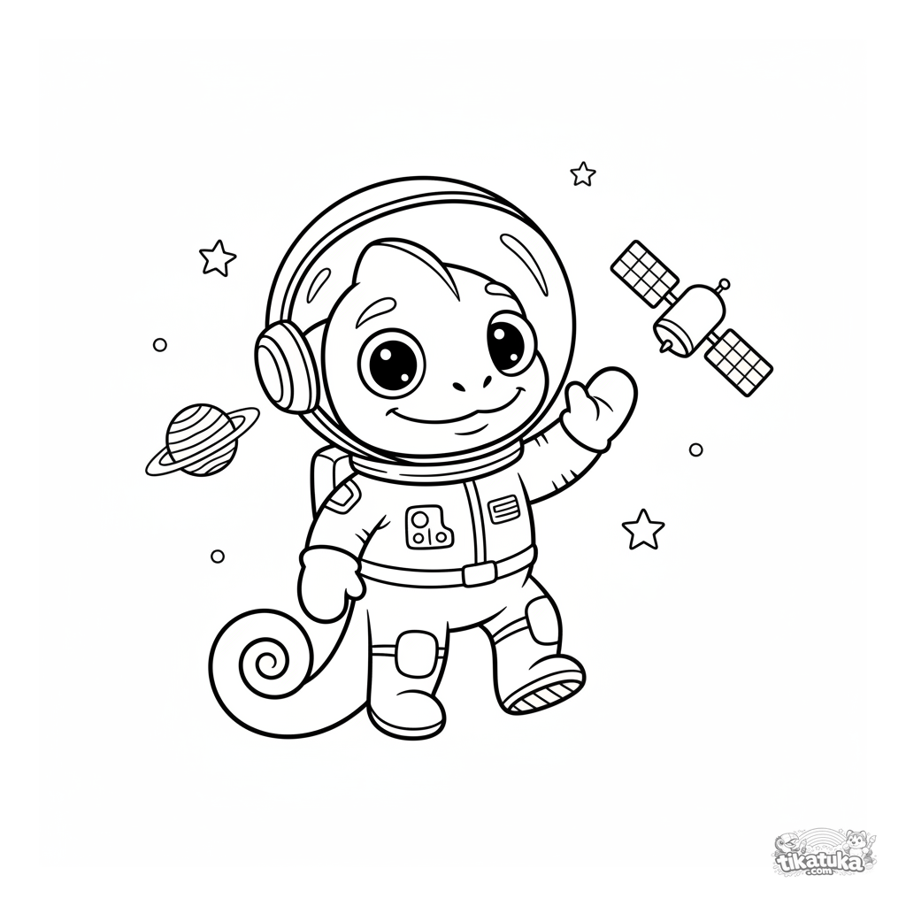 Раскраска для детей 4-6 лет: хамелеон Радик в космическом скафандре весело парит в открытом космосе, махая рукой спутнику.