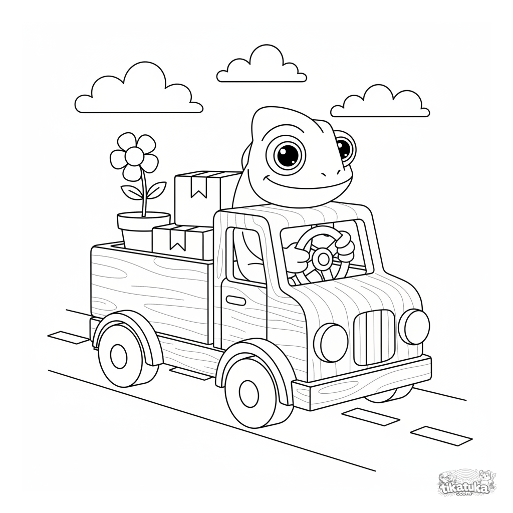 Раскраска с транспортом для мальчиков 4-6 лет: хамелеон Радик ведет игрушечный деревянный грузовик с посылками. Четкие геометричные формы, узнаваемый транспорт, простой фон.