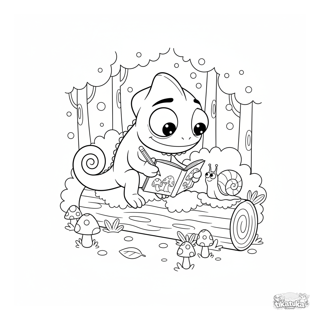 Раскраска для детей 4-6 лет. Милый хамелеон Радик рисует грибы в лесу. Скандинавский плюшевый стиль, чистые линии, широкие поля для раскрашивания.