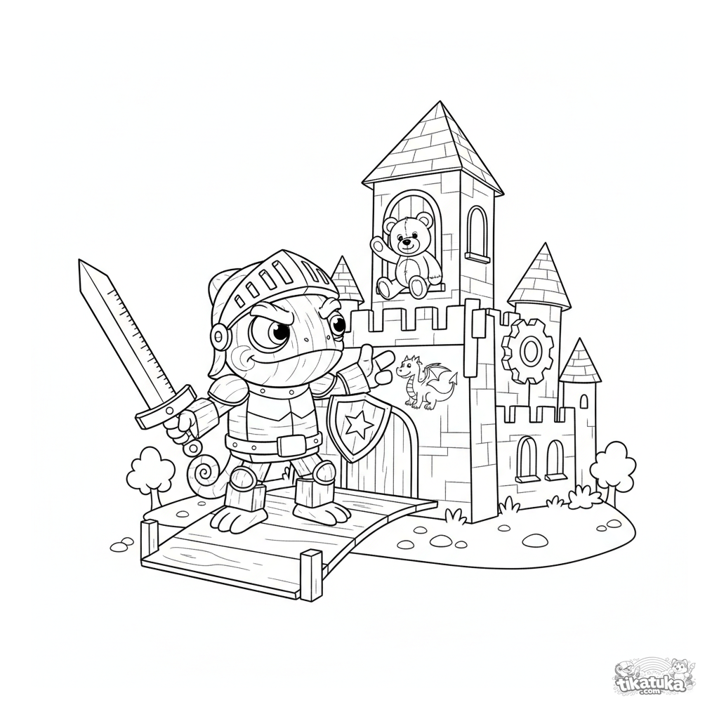 Раскраска для мальчиков 4-6 лет. Хамелеон Радик в доспехах рыцаря спасает плюшевого мишку из картонного замка. Стиль деревянной игрушки, простые формы, широкие поля.
