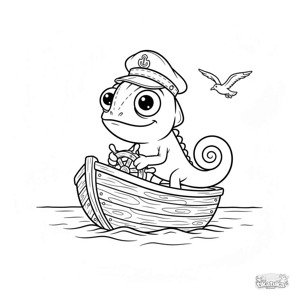 Раскраска для детей 4-6 лет: хамелеон Радик в бескозырке уверенно управляет маленьким деревянным парусником на спокойном озере.