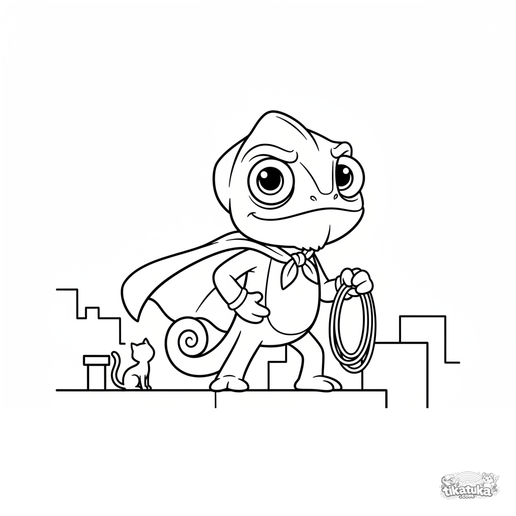 Раскраска для детей: хамелеон Радик в роли супергероя на крыше города. Динамичная и вдохновляющая сцена о храбрости и помощи другим.