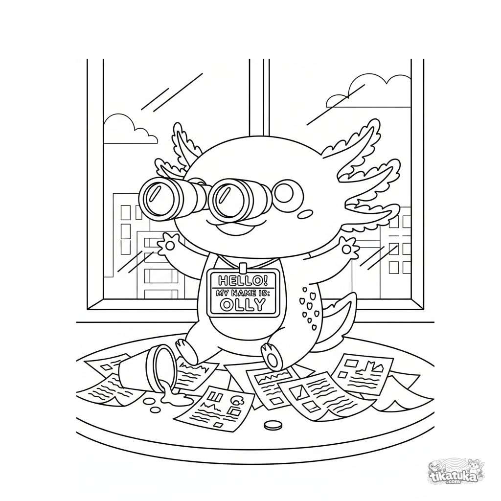 Раскраска для детей 10-12 лет: хаотичный аксолотль в офисе прилип к окну и смотрит в бинокль, высматривая зарплату. Детализированный смешной мем.