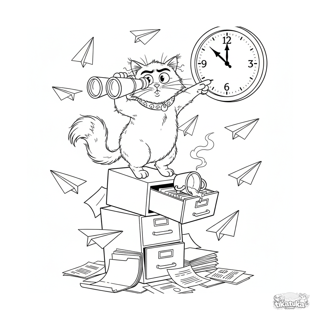 Раскраска для детей 10-12 лет: хаотичный кот в офисе, балансирующий на шкафах с биноклем, в панике смотрящий на часы. Детализированный смешной мем.