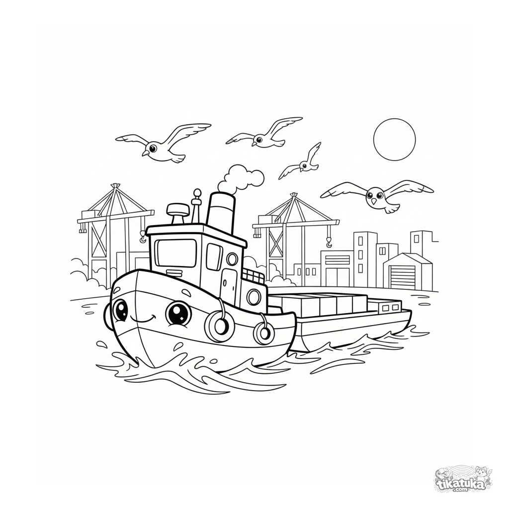 Раскраска для детей 7-9 лет: весёлый буксир толкает грузовую баржу в оживлённом солнечном порту. Динамичная сцена с чайками и кранами.
