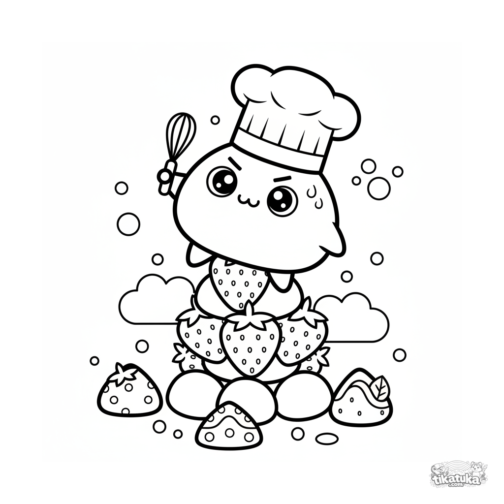 Раскраска: моти в колпаке повара балансирует на башне из клубники. Для детей 7-9 лет. Забавная кавайная сцена с едой.