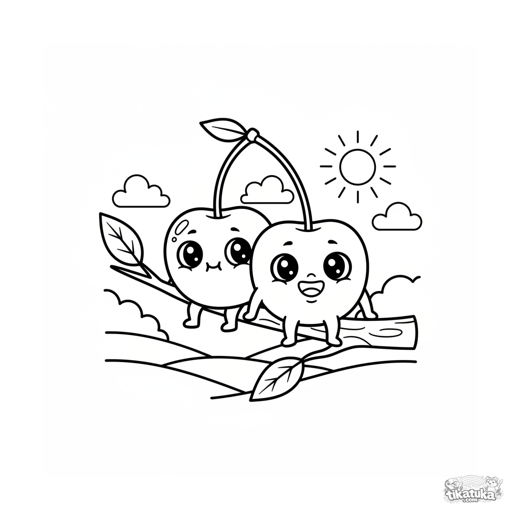 Раскраска для детей 4-6 лет: две весёлые вишенки-чиби на веточке, одна прячется за другой. Милое взаимодействие, простые формы, игривое настроение.