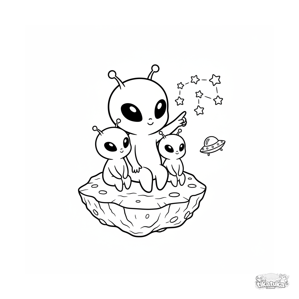 Раскраска для детей 4-6 лет: милая семья инопланетян в стиле чиби сидит на астероиде и смотрит на звёзды в открытом космосе. Простые формы.