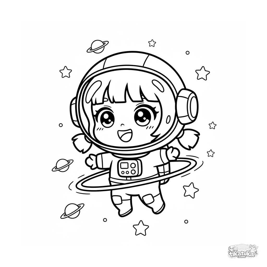 Весёлая раскраска для детей 4-6 лет: милый космонавт в стиле чиби крутит обруч в невесомости. Крупная голова, простые формы, радостная эмоция.
