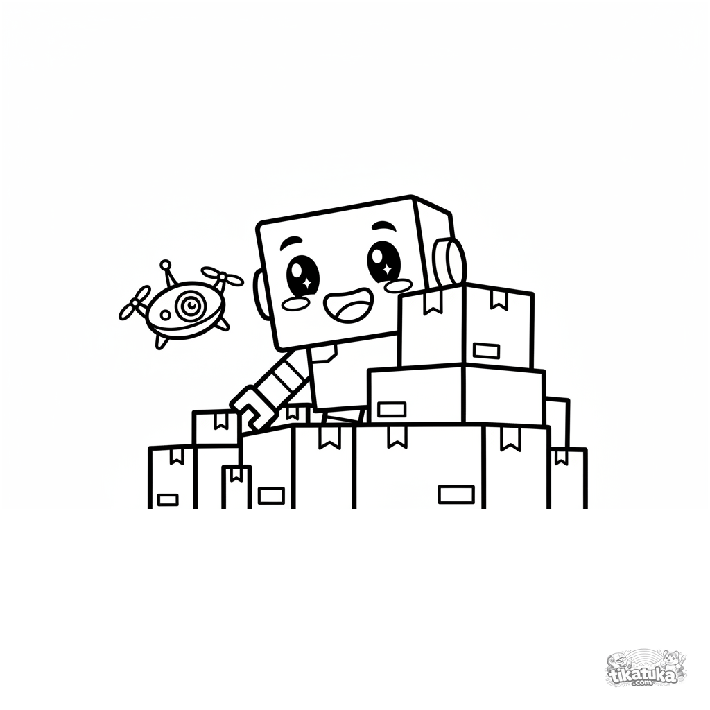 Простая раскраска для малышей 2-3 лет: милый робот-коробка играет в прятки на складе. Крупные формы, очень толстые контуры, почти нет фона.