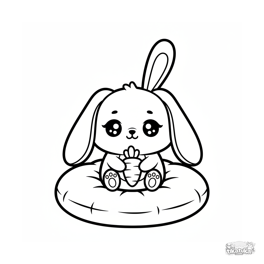Раскраска для малышей 2-3 лет: плюшевый кролик сидит на мягкой подушке. Простые крупные формы, мало деталей, идеально для первых карандашей.