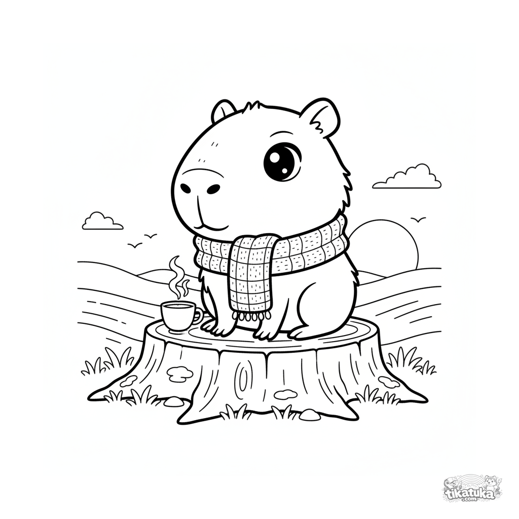 Милая раскраска в стиле чиби для детей 4-6 лет: капибара в шарфе на пне смотрит на закат. Простые формы и уютная атмосфера.