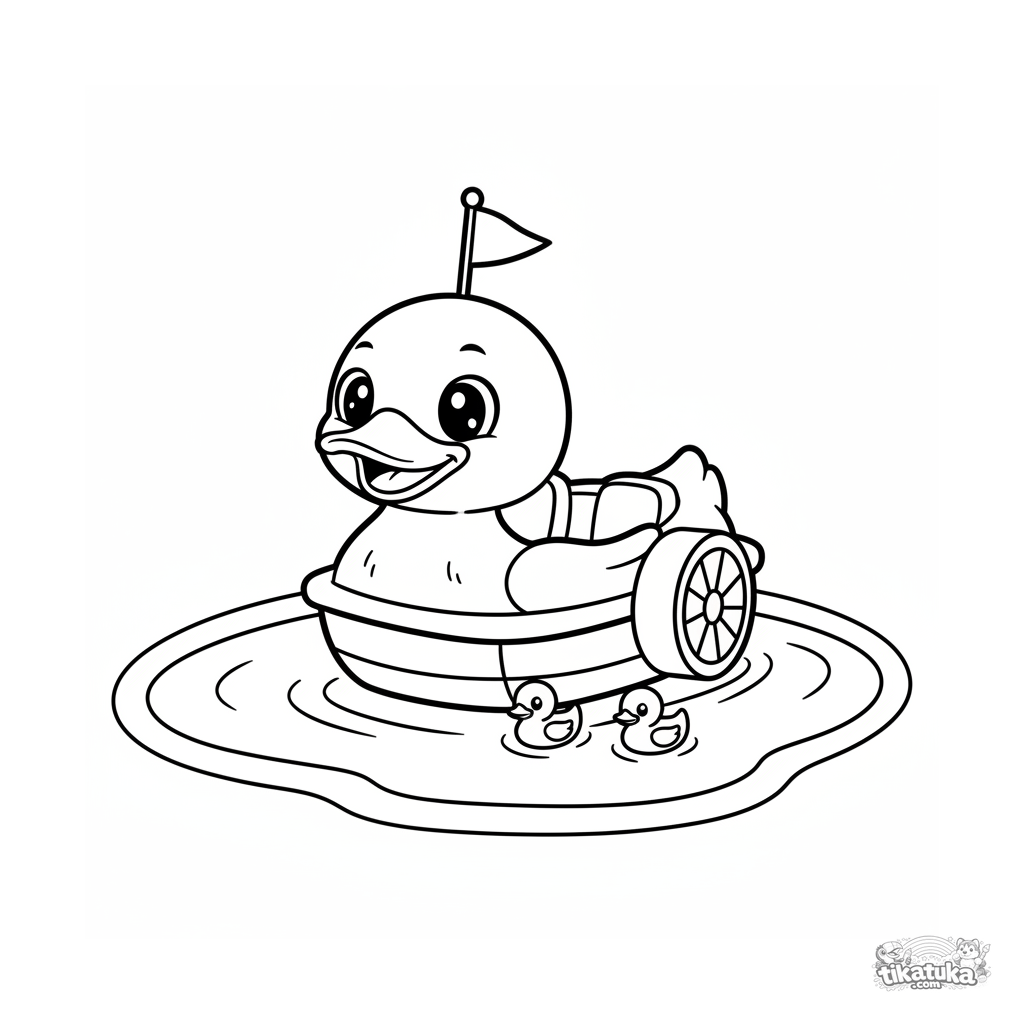 Простая раскраска для малышей 2-3 лет: милая мультяшная лодка-утка в парковом пруду. Крупные формы, очень мало деталей, широкие поля.