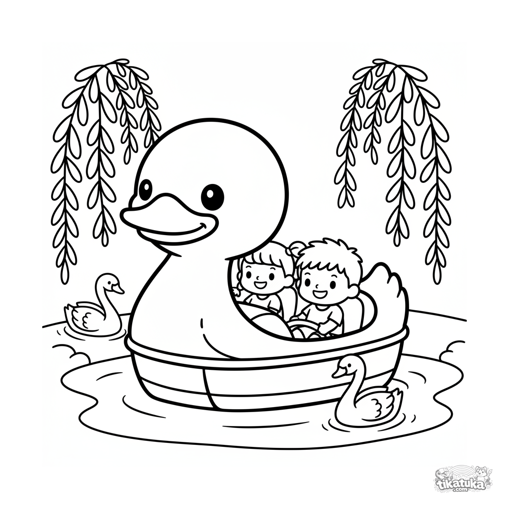 Раскраска для малышей: милая педальная лодка в форме утёнка плывёт по пруду в парке. Очень простые и крупные формы, широкие поля.