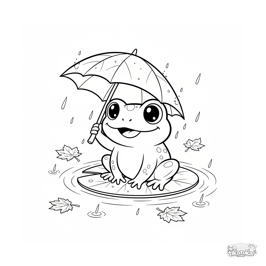 Раскраска для детей 7-9 лет: милый лягушонок в стиле аниме сидит на кувшинке и держит большой кленовый лист как зонтик под осенним дождём. Забавная сценка, умеренная детализация.