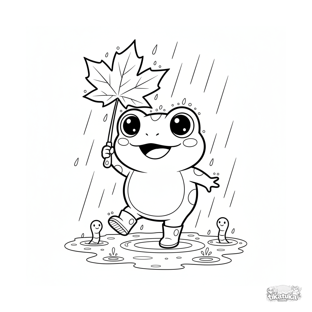 Раскраска для детей 4-6 лет: милый лягушонок в стиле чиби в резиновых сапожках весело танцует под дождём, укрываясь большим кленовым листом. Простые формы, милое выражение.