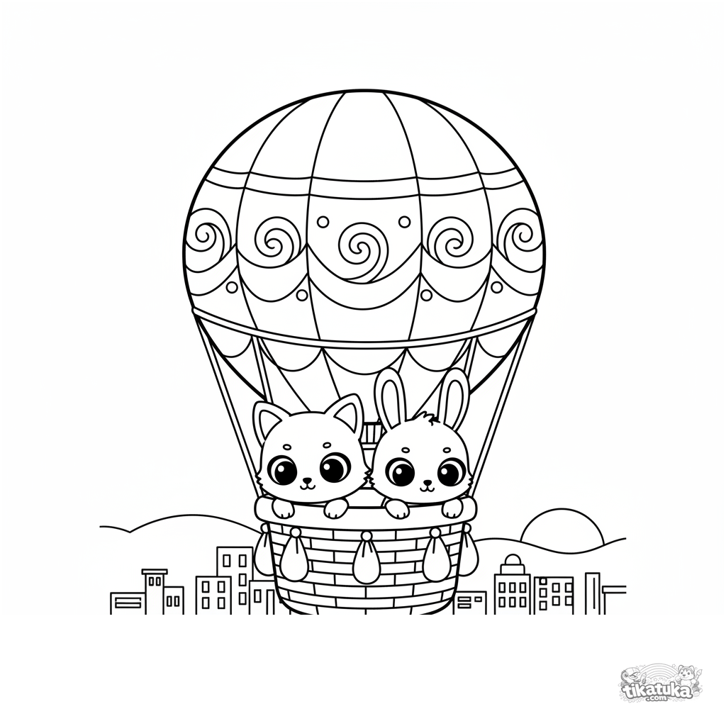 Раскраска с милым воздушным шаром в стиле чиби, летящим над городом. Для детей 4-6 лет. Простые формы, дружелюбные персонажи.