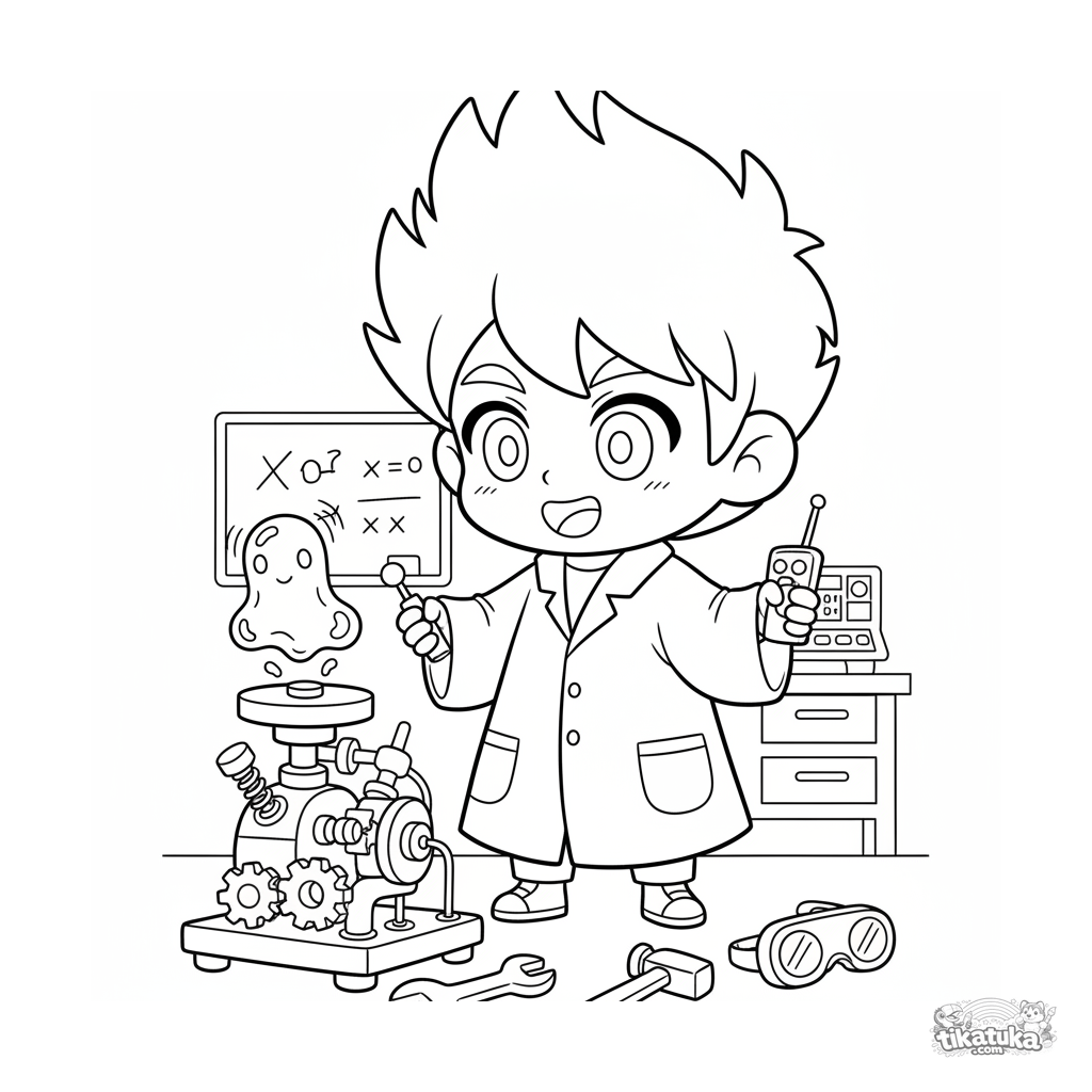 Раскраска для детей 4-6 лет в стиле чиби: весёлый изобретатель в секретной лаборатории тестирует пускатель желе. Яркая, простая сцена с чёткими контурами для раскрашивания.