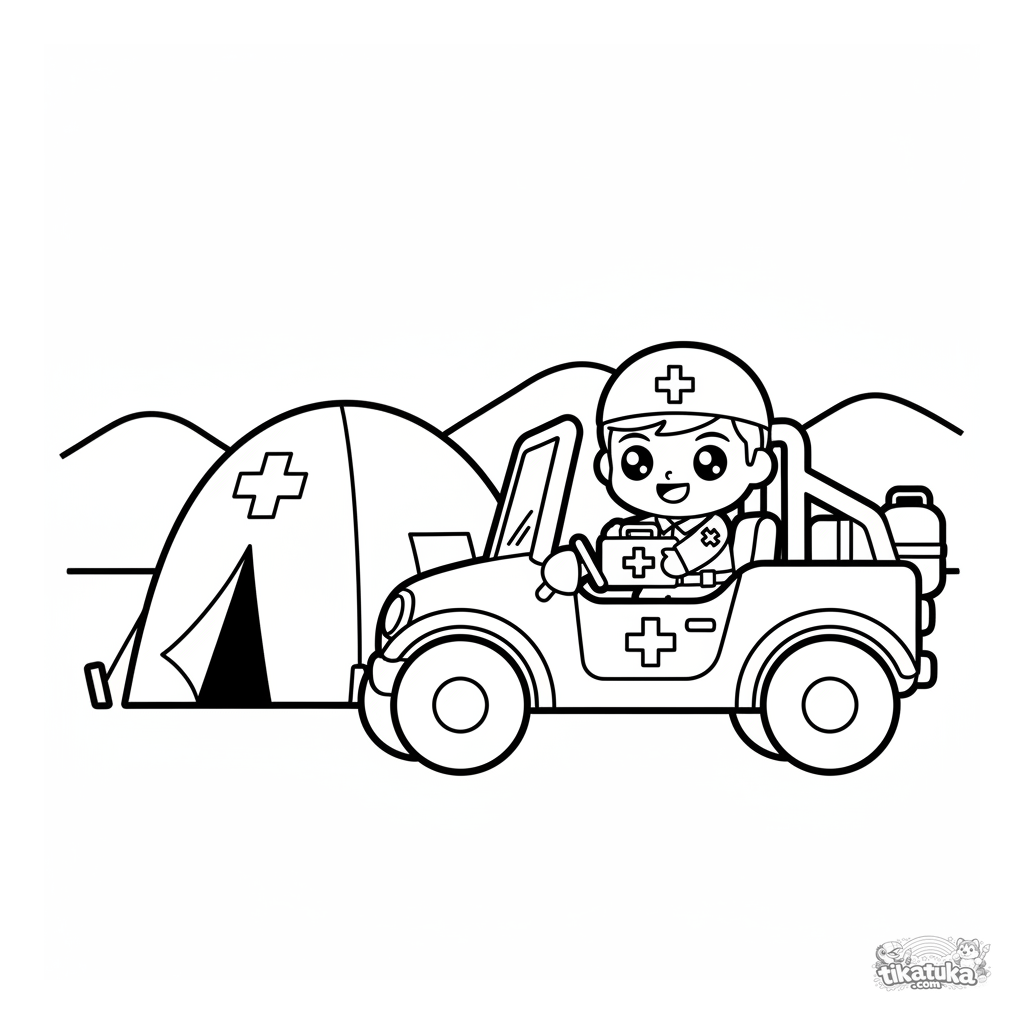 Простая раскраска для малышей 2-3 лет: милый санитарный багги с красным крестом припаркован у палатки полевого госпиталя. Большие простые формы.