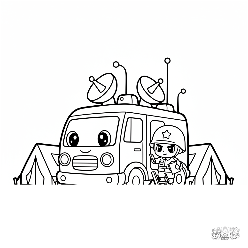 Простая раскраска для малышей 2-3 лет: милый чиби-грузовик мобильного командного центра с антеннами стоит среди палаток полевого штаба. У машинки улыбающаяся мордочка.