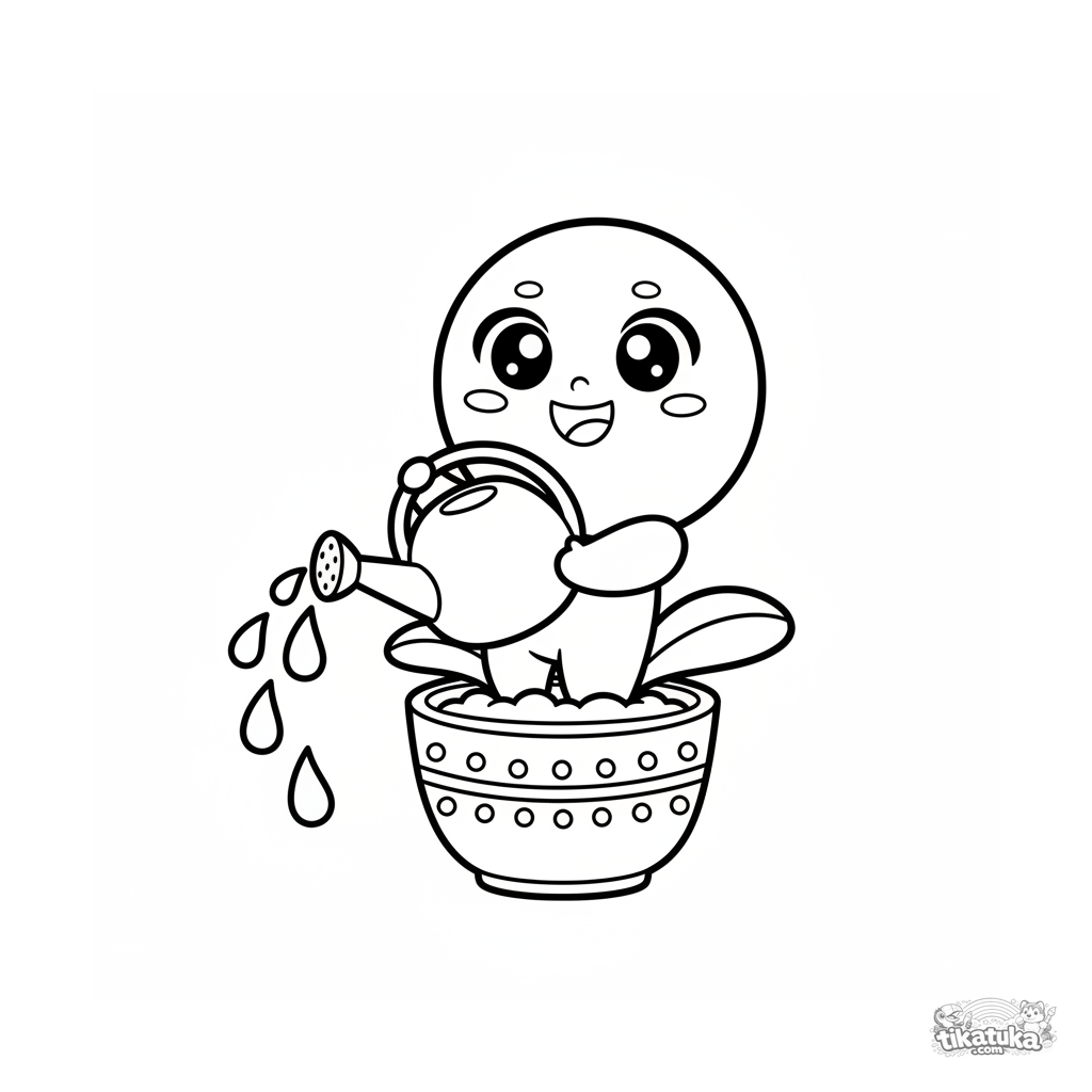 Простая раскраска для малышей 2-3 лет: милая орхидея-чиби пытается полить себя из большой лейки. Огромная голова, простые формы.