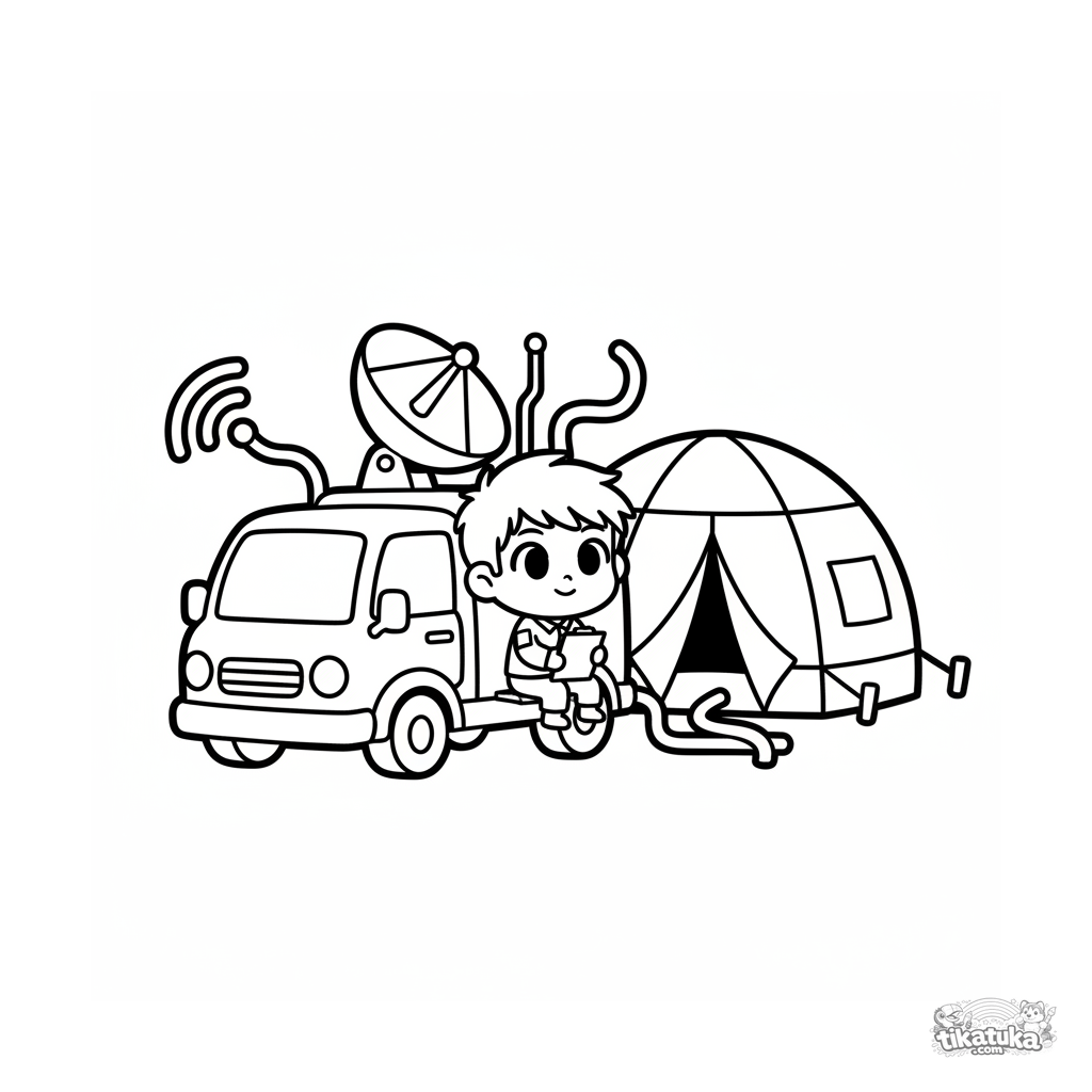 Простая раскраска для малышей 2-3 лет: милый радиофургончик с тарелкой-антенной стоит у палатки полевого штаба. Солдатик с планшетом. Крупные формы, толстые контуры.