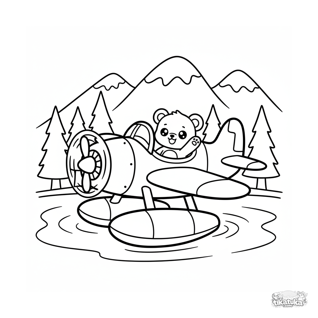 Простая раскраска для малышей 2-3 лет: милый гидроплан в стиле чиби взлетает с горного озера. Крупные формы, толстые контуры, мало деталей.