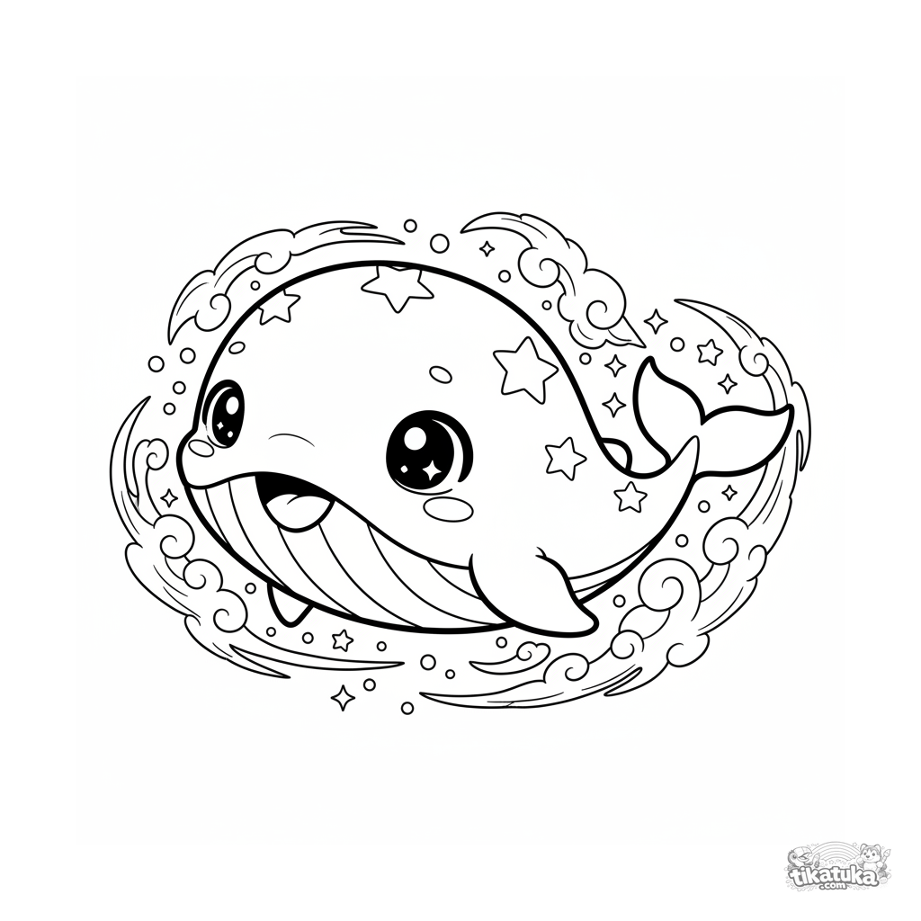 Раскраска для детей 4-6 лет: милый кит в стиле чиби плавает в космической туманности среди звездной пыли. Большие глаза, простые формы, веселая сцена.