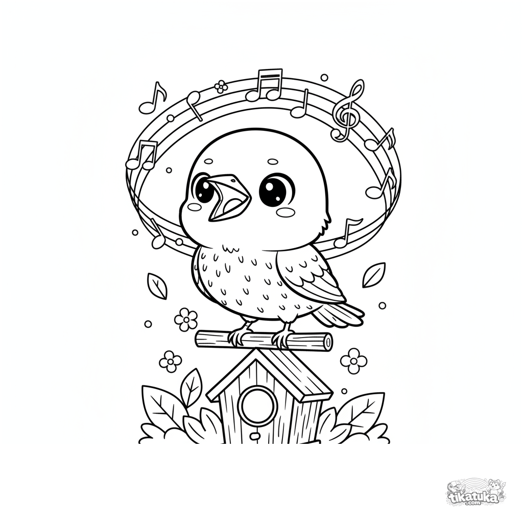 Раскраска для детей 4-6 лет в милом стиле чиби: весёлый скворец поёт на жёрдочке у деревянного скворечника. Крупная голова, простые формы, летают нотки.