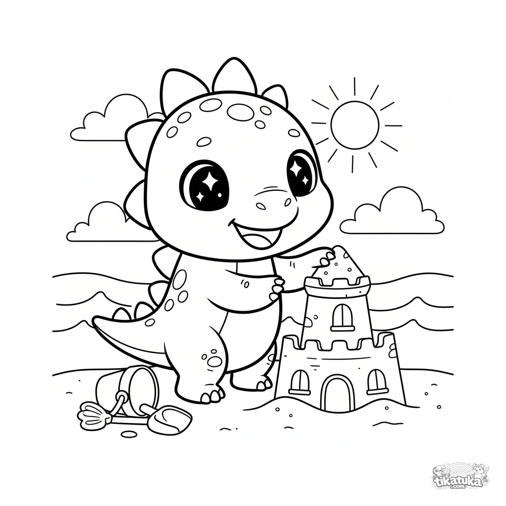 Раскраска для детей 4-6 лет: милый чиби-стегозавр строит песочный замок на пляже древнего океана. Забавная сцена, полное тело, широкие белые поля для раскрашивания.