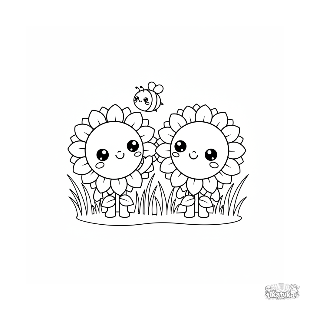 Раскраска для детей 4-6 лет: милые подсолнухи в стиле чиби в поле с пчелой. Забавные пропорции, простые детали, дружелюбная сцена.