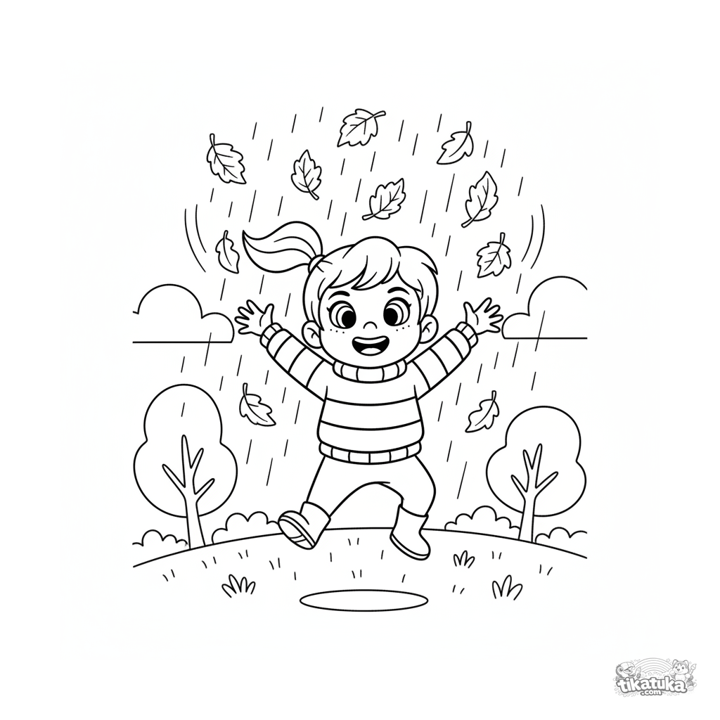 Раскраска для детей 4-6 лет: ребёнок в сапогах весело прыгает, ловя падающие осенние листья под дождём. Умеренная детализация, динамичная поза, понятные формы.