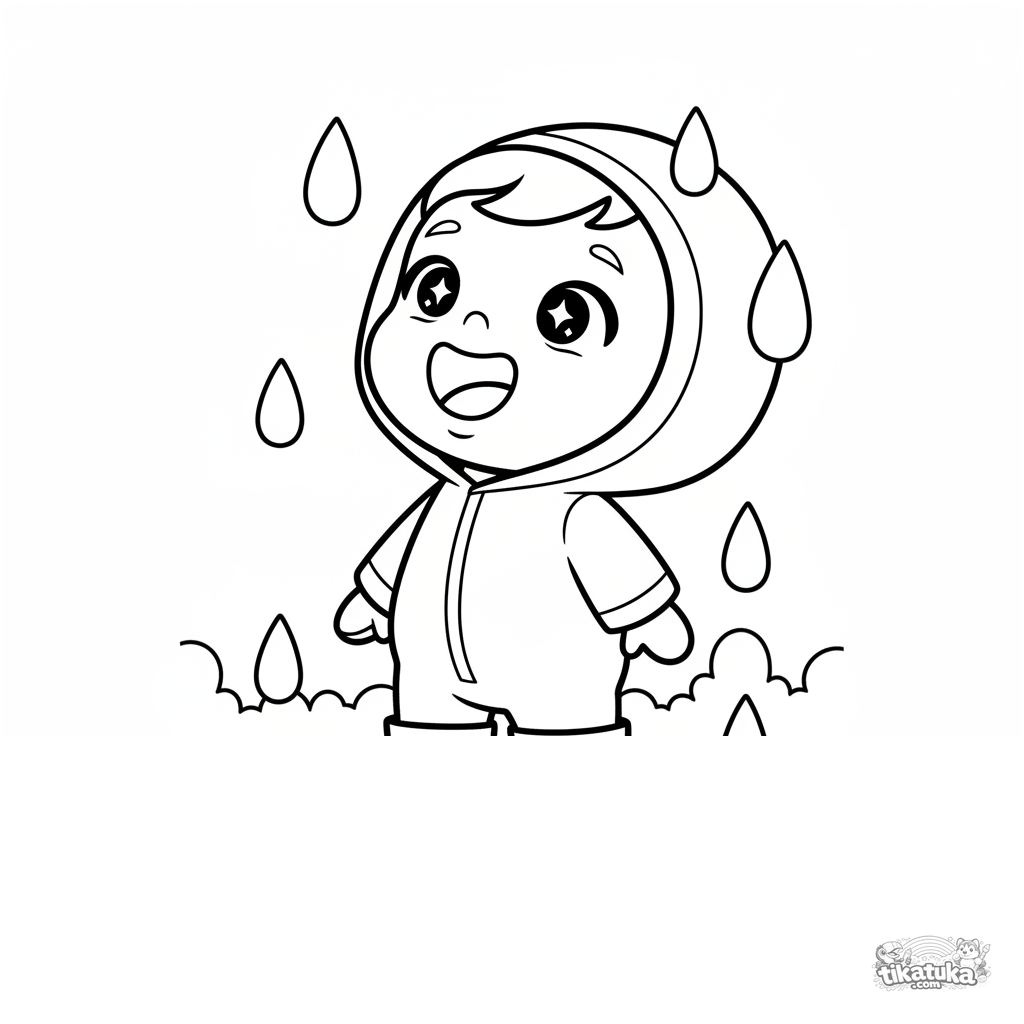 Раскраска для малышей 2-3 лет: забавный малыш в комбинезоне и сапогах ловит языком осенние капли дождя. Огромные простые формы, максимум свободного места.