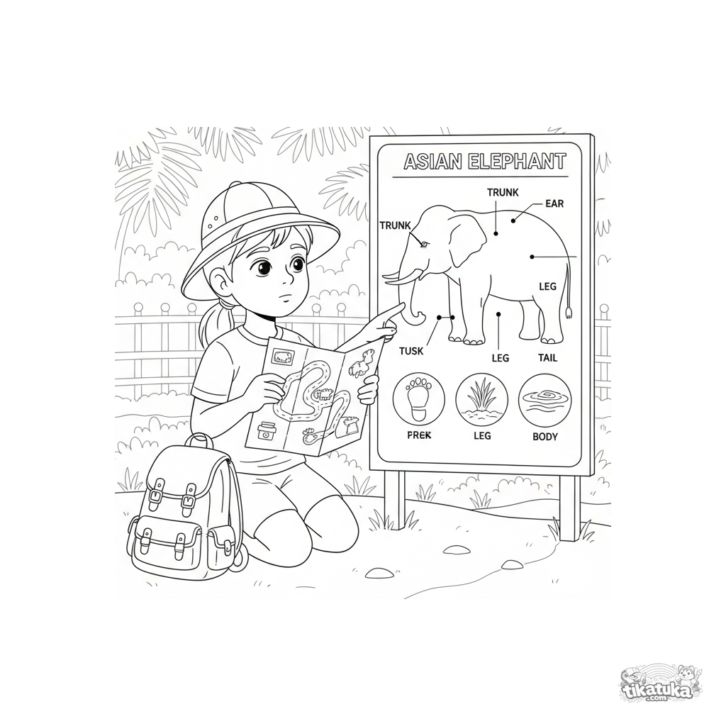 Детальная раскраска для детей 10-12 лет: ребенок сравнивает карту зоопарка с информационной доской об анатомии азиатского слона. Образовательная сцена про исследование и обучение.