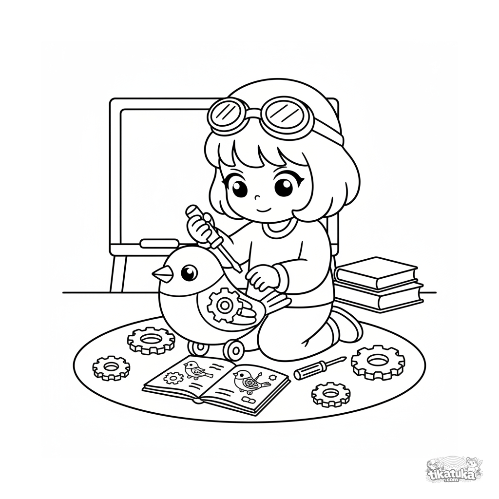 Раскраска для малышей 2-3 года: юный изобретатель в очках на лбу чинит заводную игрушку на полу в классе. Простые формы, крупные детали.