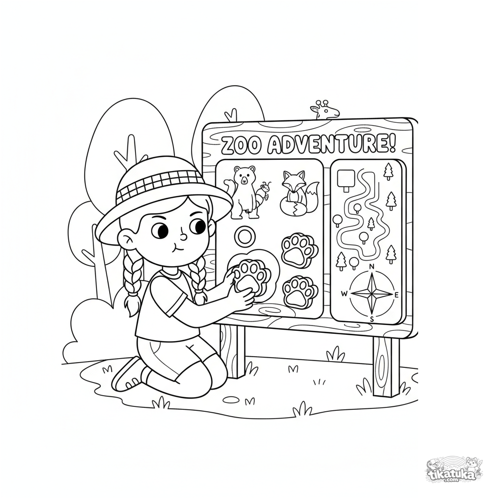Раскраска для детей 4-6 лет: ребенок сопоставляет деревянные следы животных с их силуэтами на большом интерактивном указателе тропы в зоопарке. Обучающая игровая сцена.