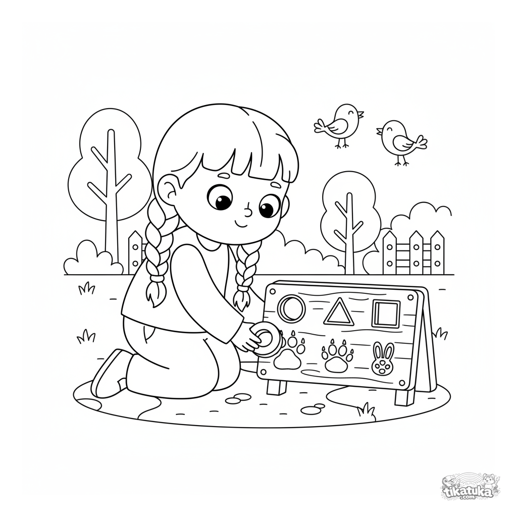 Раскраска для детей 4-6 лет: ребёнок играет с интерактивной табличкой, сопоставляя геометрические фигуры со следами животных в зоопарке. Обучение через игру.