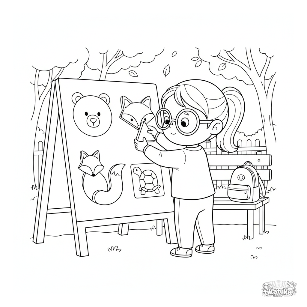 Раскраска для детей 7-9 лет: ребенок сопоставляет геометрические фигуры с силуэтами животных на обучающей доске в зоопарке. Умеренная детализация, четкие контуры.