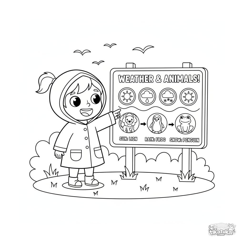 Раскраска для детей 4-6 лет: ребёнок изучает табличку о погоде и животных в зоопарке. Яркие символы солнца, дождя и снега, простые формы для раскрашивания.