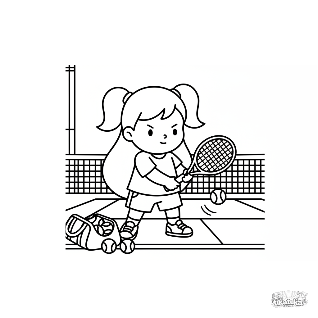 Раскраска для детей 4-6 лет: ребёнок усердно тренирует удар у теннисной стенки на корте. Простые формы, мяч, ракетка, сумка.